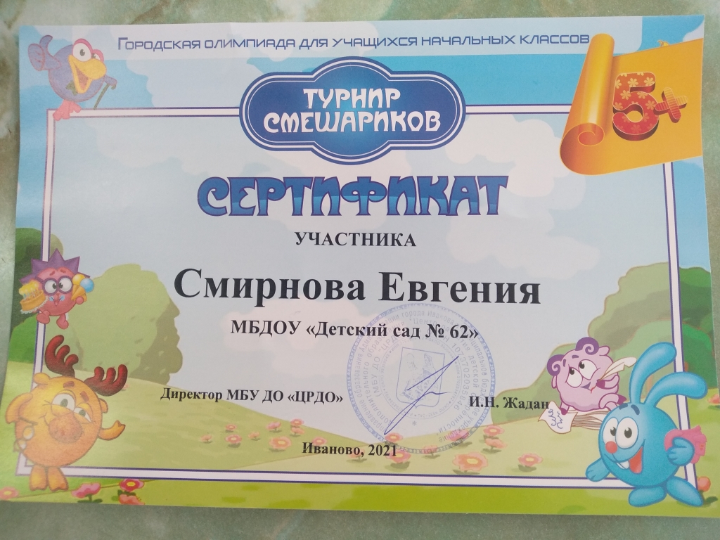 | 5 апреля в МБУ ДО «Центре развития детской одаренности» состоялась городская олимпиада для дошкольников «Турнир Смешариков 5+». Основными целями и задачами олимпиады являются выявление, поддержка и продвижение одаренных детей. Честь нашего детского сада на городском «Турнире Смешариков» отстаивала воспитанница 2 группы "Звездочки" Смирнова Евгения. Надеемся, что она справилась со всеми предложенными заданиями. Ждем подведения итогов и желаем ей успехов! |
