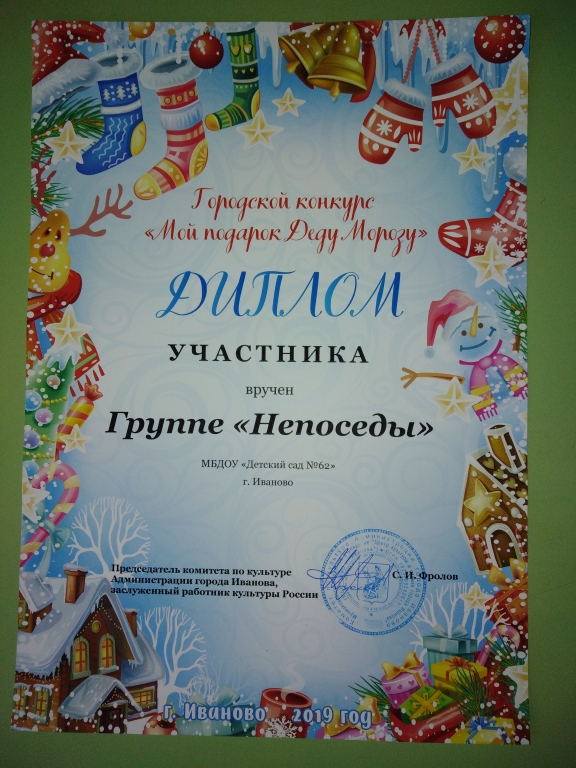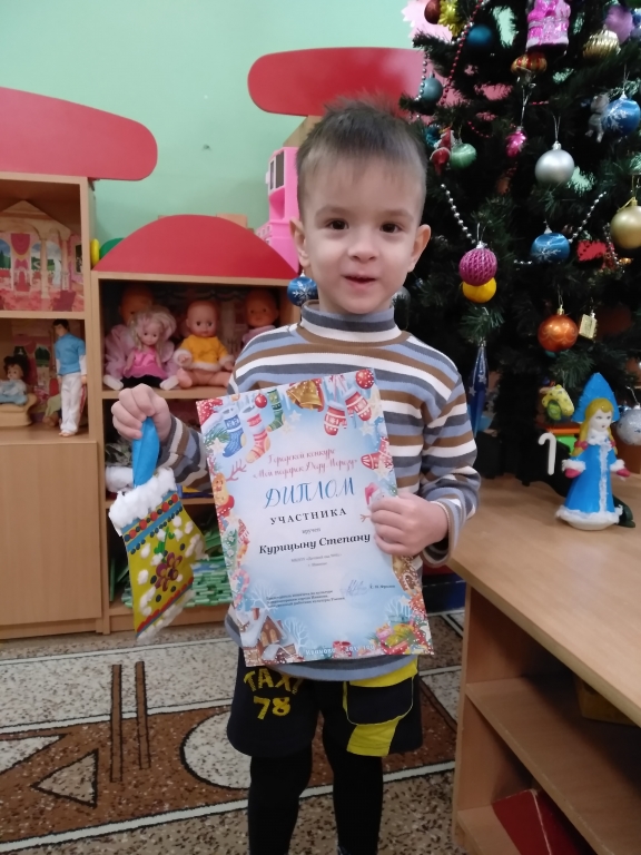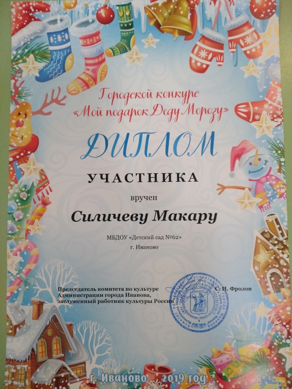| Воспитанники детского сада, под руководством педагогов Брюхановой М.А., Курицыной М.С., Жуковой Е.С., Нескиной А.А., приняли активное участие в творческом конкурсе «Подарок Деду Морозу». Конкурс организован комитетом по культуре и отдыху Администрации г. Иваново. |
