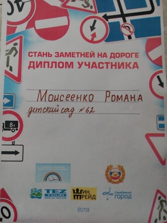 | Воспитанник ДОУ, Моисеенко Рома, под руководством воспитателя Заботлиной Н.А., принял участие в конкурсе «Стань Заметней на дорогах». |