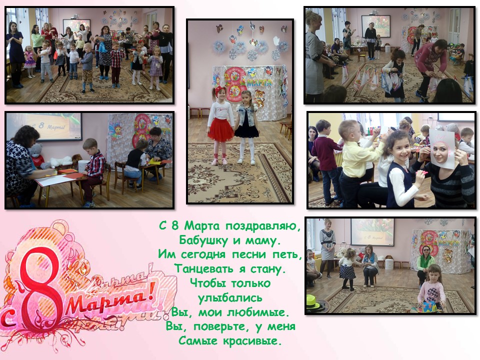 «8 марта –международный женский день!» На улице еще лежит снег, а на календаре уже весна! И это прекрасное время года открывает женский праздник. В в нашем детском саду прошли праздничные мероприятия, посвященные Дню 8 Марта. В своих песнях, стихах дошколята рассказали о своей любви к самым близким и дорогим людям. Мамы задорно пели, с радостью принимали участие в шуточных конкурсах и соревнованиях. Благодарные дочки и сыночки дарили своим любимым мамочкам, бабушкам, сестренкам те самые нежные слова, которые греют душу, поселяют в сердце радость, счастье, весеннее настроение. Специально для дорогих женщин воспитанники старательно готовили праздничные открытки с самыми теплыми словами пожеланий молодости, любви, радости. Праздничные мероприятия, несомненно, привнесли в жизнь детского сада атмосферу весенней радости и счастья. Коллектив нашего детского сада от всей души поздравляет всех мам, бабушек, дочек и сестренок с международным женским днем 8 Марта! Желаем вам море цветов, солнечных дней и, конечно, любви родных и близких! |
