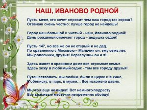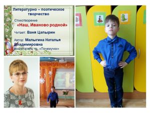 Наш, Иваново родной 16 марта воспитанник подготовительной группы "Почемучки", Ваня Цапырин, принял участие в городском конкурсе «Струны ситцевой души», который проводится в год 100-летия Ивановской губернии с целью воспитания любви и уважения к родному краю. Учредителями Фестиваля является управление образования Администрации города Иванова. Ванечка выступал в номинации «Литературно-поэтическое творчество». Он представил на суд жюри авторское стихотворение «Наш, Иваново родной». Написала это замечательное произведение воспитатель нашего детского сада, Малыгина Наталья Владимировна, которая смогла в поэтической форме рассказать о любви шестилетнего мальчика к родному городу, о семье, о дружбе ребят в детском саду. |
